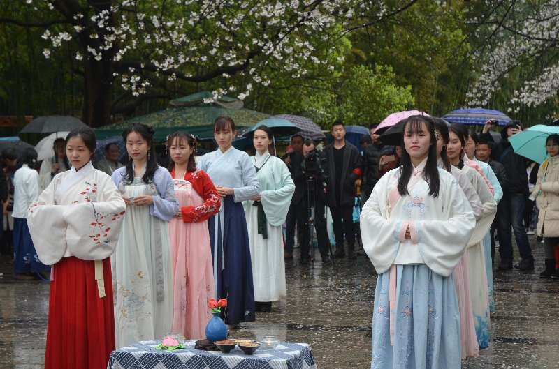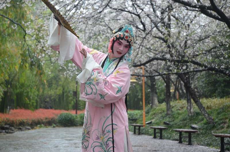 一场延续古人祭奠花神、游春赏花的传统活动——花朝节在樱花湖畔如期进行,本期活动与TOP旅行全媒体联合举办。悠扬的萧声穿过花丛间激起阵阵涟漪,少女们身着汉服在樱花树下祈求花神降福,保佑花木茂盛。昆曲表演的老师甩动衣袖唱出千年的韵味,滚落在花瓣上的雨珠儿,倒映着婀娜的身影,妩媚而动人,许多游客赞叹雨中赏花听曲竟是如此美妙,犹如天上人间!