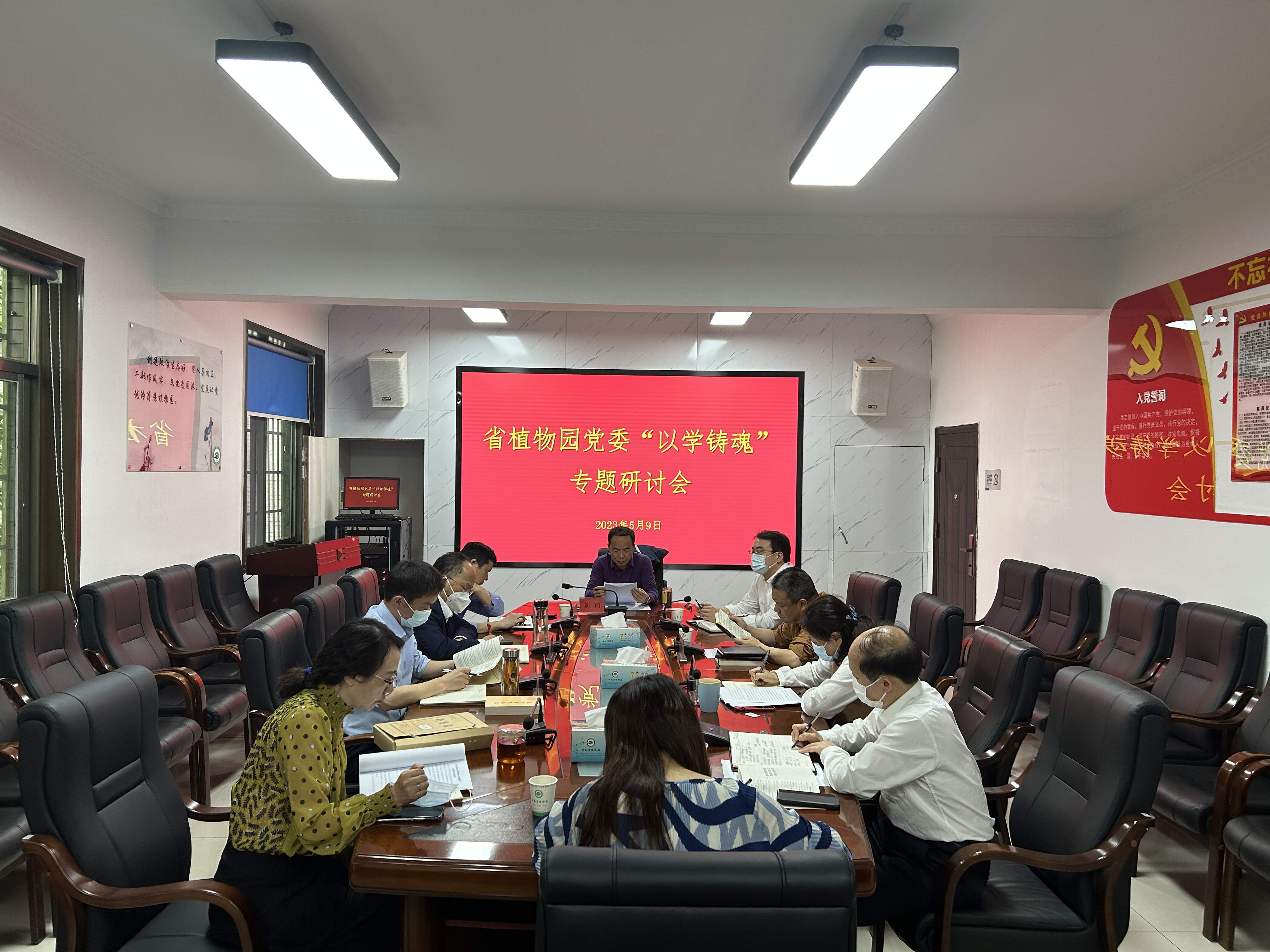 为深入贯彻落实习近平新时代中国特色社会主义思想主题教育学习,按照省局“读书班”统一安排,5月9日,省植物园党委理论学习中心组开展“以学铸魂”专题研讨。园党委书记刘玮主持会议并讲话。园党委副书记、主任马涛作中心发言,其他班子作交流发言。会上大家围绕“以学铸魂”主题谈认识、谈感受、谈怎样学思用贯通、谈如何知信行统一,讨论氛围热烈。