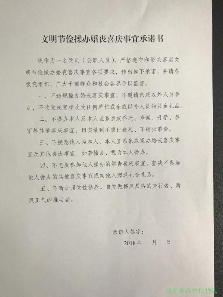 全园现已有157人(包括所有在职职工以及退休党员)签约了“文明节俭操办婚丧喜庆事宜承诺书”,通过发放承诺书,号召大家节俭操办婚丧喜庆事宜,不讲排场、比阔气,破除陈规陋习,倡议引导、立规明约,大力推动移风易俗进单位,树立文明新风。活动中,其中很多党员都以“我是党员,我带头”的精神积极踊跃签署承诺书,通过签约“文明节俭操办婚丧喜庆事宜承诺书”节俭意识和法纪意识进一步增强,使文明节俭操办婚丧喜庆事宜真正落到实处,做到家喻户晓、人人皆知。