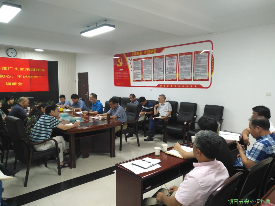 7月1日,在喜迎中国共产党九十八岁华诞之日,省林业局科外推广支部来我园开展“不忘初心 牢记使命”专题调研。省局科外处处长姜芸、省林业科技推广总站站长杨建飞、科外推广支部全体成员、园副主任何友军和李柏海、各研究所主要负责人及科管处全体人员参与了调研。调研会由园副主任李柏海主持。