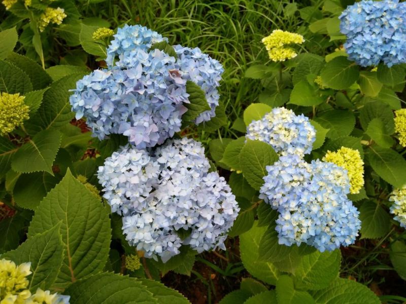 绣球花内的飞燕草色素与酸性环境中的铝元素能够结合,而且不易被酸侵蚀,恰好该作用有利于蓝色的形成,所以在酸性土壤(PH小于5)条件下,绣球花是蓝色的。如果是在偏中性土壤(PH接近7)条件下,植株吸收不到足够的铝,开出的花的颜色要么是混合,要么是红色或粉色。