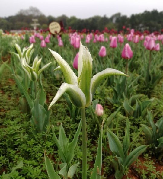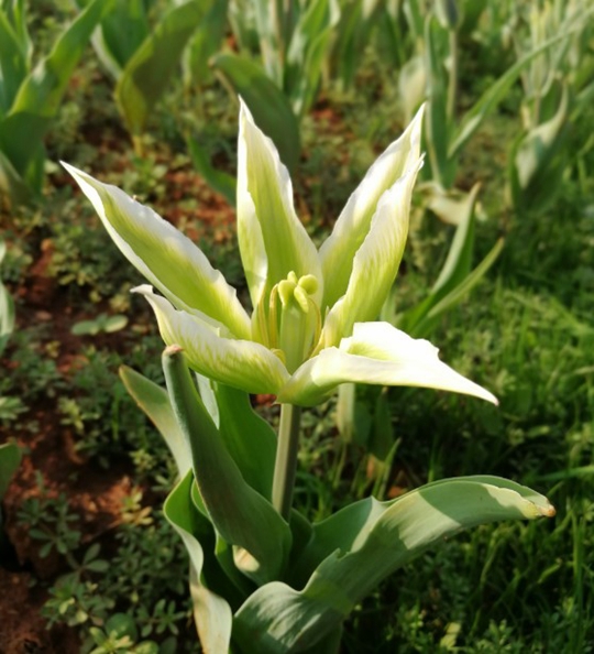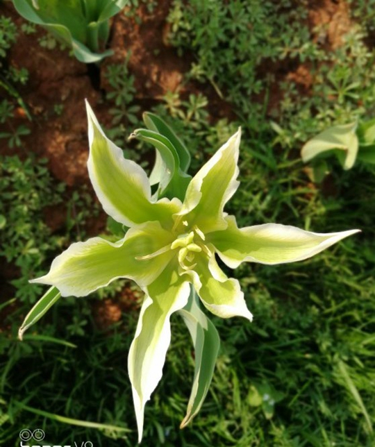 小编今天为大家推荐的郁金香品种——绿星(现处于初开期),此品种是我园第一次引进。花单瓣,绿色与白色相间,是双色花瓣,属晚花单瓣系,百合花形。伙伴们都说它形状似海底的海星。