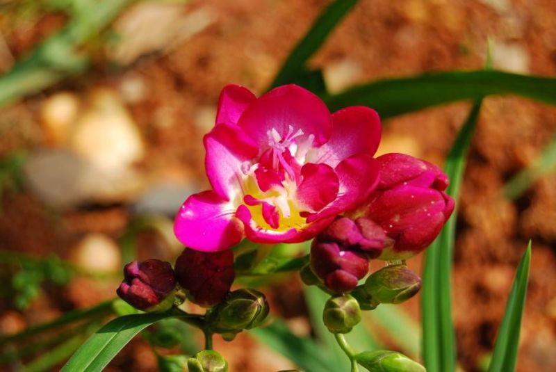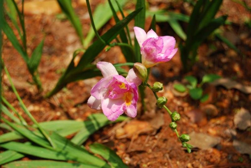 3、小苍兰(Freesia)为鸢尾科香雪兰属多年生球根花卉,叶子线形,穗状花序,花偏生一侧,有香味,花期4~5月。植物园有蓝色的‘塔希提’、粉白色的‘蜜月’、紫色的‘紫雨’、红色的‘红色之美’、黄色的‘旖旎’,都已陆续开花。观赏地点:动物园路沿线。