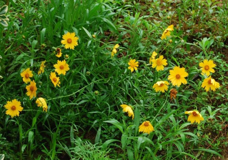 大金鸡菊(Coreopsis lanceolata)别名狭叶金鸡菊、剑叶金鸡菊,菊科金鸡菊属多年生草本,高30~70厘米,叶片匙形或线状倒披针形,花黄色,花期5-9月。原产北美,耐旱、耐涝、耐寒、耐热、耐瘠薄,适宜性极强,在全国各地广泛应用。它是华中农业大学的校花,传说是因为其出色的适应性和观赏性在绿化校园中立了大功,大金鸡菊象征着顽强上进,深受师生的喜爱。