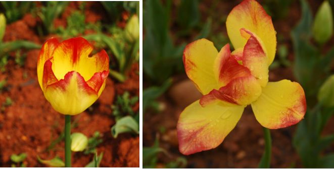 连天的雨,将一些郁金香的花瓣打落或是打散开,露出娇嫩的花蕊来,有些则纤弱的弯下了腰。有的却在半开半合间有了舞动的姿态,恰巧它的名字就是‘舞女’:明亮鲜艳的黄色、瓣尖是缕缕清晰红色斑纹,或许它的得名是因为其花纹就像舞女精致的舞裙,而此时却看到它在风雨中的舞蹈,更像是因此而得名,那姿态看着还像一朵娇嫩的莲花(附图:晴天、雨天里的郁金香‘舞女’)。