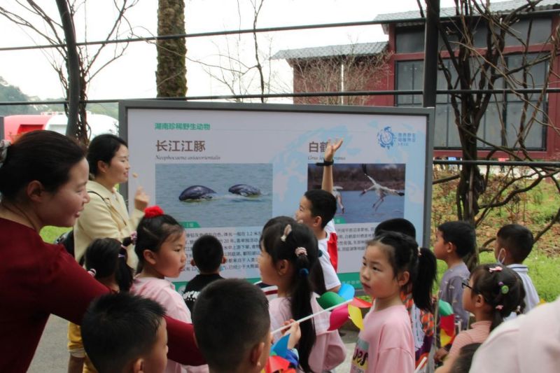 我园自然教育中心副主任黄秀老师给同学们做了精彩的解说,首先黄秀老师介绍了“世界野生动植物日”是联合国大会为了提高人们对世界野生动植物的认识而设立的节日,今年的3月3日是第9个世界野生动植物日,我们中国的活动主题就是现在大家看到的展板上写的“关注旗舰物种保护,推进美丽中国建设”。随后,黄秀老师给大家介绍了长江江豚、鸳鸯、画眉、水杉、珙桐、隆平水韭、湘妃水韭等珍稀的动植物。同学们都很认真地听黄秀老师的讲解,黄秀老师的讲解内容深入浅出,风趣幽默,互动式的问答,激发了同学们极大的兴趣,现场气氛非常热烈。