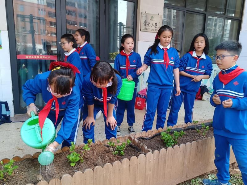 在科普课结束后,开始了栽种绣球花的实践活动。同学们分组来到教室外根据唐老师讲述的栽种流程,相互协作、分工明确,种下一棵棵绣球花。这次植树节活动,同学们不仅增加对绣球花生长、变色的了解,也使同学们在活动中体验成功的喜悦,增强了环保意识、生态意识,为学校、社会增添绿色,美化环境。