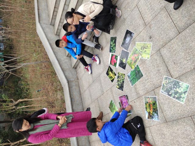 活动首先以游戏环节展开,科普中心曾主任教大家认识了迷迭香、北美红枫、南方红豆杉、月季、紫薇等植物的花、果、叶。然后将老师介绍的植物的花、果、叶的图片进行组合开展游戏。