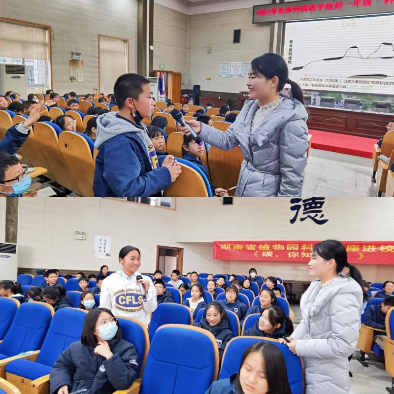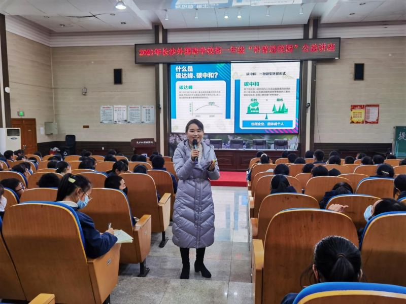 为贯彻党的十九大关于加快生态文明建设、推进绿色发展的精神,引导青少年践行人与自然、和谐共生的绿色生活发展理念,12月7日下午,我园自然教育中心的老师在黄秀副主任的带领下来到长沙外国语学校为初一年级学生进行了一场题为“碳,你知多少?”的科普讲座,将“碳中和”、“碳达峰”与低碳生活等生态文明理念涓涓汇入300多名师生的心中。