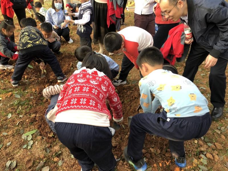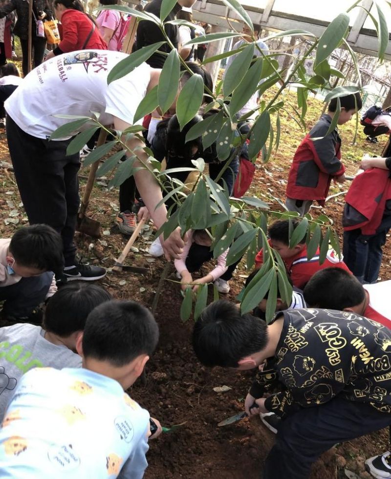 接着同学们在我园科研所吴林世老师的带领下来到了研学教室旁空地植树,吴林世老师对将栽种棱角山矾进行细致地讲解,随后同学们分成二组,每人准备好小锄头和小铲子,合作协力,兴致勃勃地在老师指导和家长的帮助下挖坑、置苗、填土、浇水,经过一番辛勤劳动,共同种下一株棱角山矾。在活动中,同学们热情高涨,积极向老师学习如何植树,脸上充满着对未知的探索和兴奋,洋溢着活力,在分组中也各司其职,密切配合,认真到位,都对自己的植树质量要求极高,不放过一点错误,整个活动进行得十分顺利,同学们即使满头大汗也不曾懈怠,现场的忙碌中糅杂着欢声笑语,一片热闹氛围。
