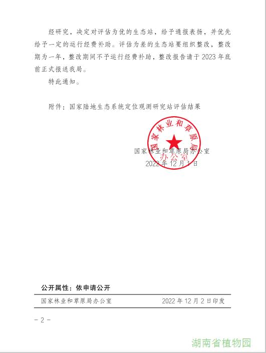 根据《国家林业和草原局科技司关于开展国家陆地生态系统定位观测研究站评估工作的通知》(林科创便字[2022]21号)和《国家陆地生态系统定位观测研究站评估方案》文件要求,为进一步加强国家陆地生态系统定位观测研究站建设管理,建立有效激励机制,充分发挥生态站作用,国家林业和草原局在各地各单位开展自评估基础上,组织专家从数据观测、科研产出、成果应用、条件保障、人才培养、机构建设等六个方面,对 166 个已建成站近五年(2017-2021年)建设管理情况进行了综合评估,并按照优、良、中、差四个等级进行评估分级。2022年12月1日,《国家林业和草原局办公室关于公布国家陆地生态系统定位观测研究站评估结果的通知》(办科字[2022]130号),进行了综合评估的166个生态站中,评估结果为优的生态站32个,其中,长株潭生态站综合评估排名14位,考评优秀,为湖南林业赢得了荣誉。国家林草局研究决定对评估为优的生态站给予通报表扬,并优先给予一定的运行经费补助。