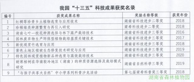 获奖成果9项。湖南省科学技术奖7项,其中省自然科学三等奖1项、省科技进步二等奖1项、省科技进步三等奖5项;梁希科技进步二等奖1项,第七届梁希科普奖三等奖1项。“耐寒桉树在华南较冷地区(湖南)的种质资源选择及栽培模式研究”(2019)获湖南省自然科学三等奖,“红椆等珍贵乡土植物选育与应用技术”(2018年)获湖南省科技进步二等奖,“湖南七叶一枝花种源选择与林下高产栽培技术”(2016)、“园林废弃物生产环保型植物栽培基质关键技术”(2017)、“新优观赏竹选育与应用”(2018年)、“紫色土地区植被生态修复技术研究与应用”(2019)和“特色园林观赏植物新品种选育与高效栽培技术”(2020)获湖南省科技进步三等奖。“珍稀雉类种源繁育与再引入研究”(2018)获评梁希科技进步二等奖,“‘与孩子共享大自然’中小学系列科普沙龙活动”(2018)获评第七届梁希科普奖三等奖。
