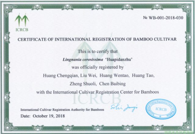 近日,我园培育的‘花皮单竹’Lingnaniacerosissima‘Huapidanzhu’在国际竹类栽培品种登录中心成功登录,国际登录号为NO.WB-001-2018-030。
