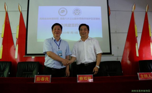 在研讨会暨签约仪式上,莅临会议的国家、省、县及合作双方单位领导分别致辞,文香英主任和植物园田晓明博士先后做了学术报告,既共同研讨国家级自然保护区建设、植物学研究工作站管理等宏观议题,同时也就树木保护、濒危植物长果安息香遗传多样性研究与综合保护等具体项目进行了深入细致的交流。会上,彭春良书记和蔡双林主任共同签署“湖南植物园八大公山植物学研究工作站”共建合作协议,与会领导、专家共同见证和为工作站揭牌。