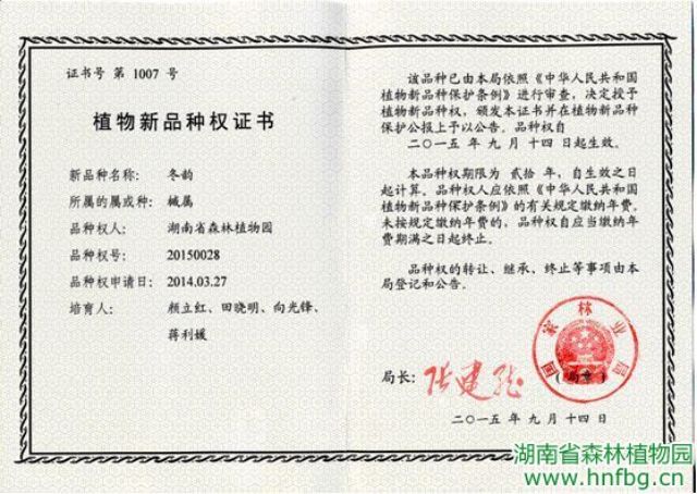 我园颜立红等研究人员从红翅槭中选育出新品种“冬韵”,新品种特异性表现为:冬芽颜色呈深红色,小枝从冬季到初春颜色呈紫红色,叶片颜色从冬季到初春呈紫红色或红褐色。该品种经嫁接繁殖后与母本特征一致。经过4年的连续观测,其特征稳定不变。同时,该品种适生区域和红翅槭相同,在湖南、湖北、广东、广西、江西和四川等省海拔200 m-1000 m的范围内均能种植,具有良好的推广应用前景。国家林业局依照《中华人民共和国植物新品种保护条例》进行审查,决定授予我园“冬韵”植物新品种权并颁发植物新品种权证书。