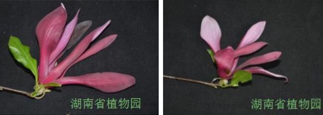 “岳阳县生物多样性调查”项目由我园副主任李柏海研究员主持承担,2023年4月,我园二级研究员颜立红和二级研究员蒋利媛在该项目实施的野外调查中,于岳阳县月田镇发现了紫玉兰野生种群。该种群共有4个居群、约20株(蔸),经仔细观察,花被片9,外轮3片,或萼片状,紫绿色,披针形,长约1.1厘米,宽约0.3厘米,或花瓣状,肉质,紫红色,但比内两轮小,长2-3.5厘米,内两轮肉质,外面紫色或深紫红色,内面带白色,花瓣状,匙状披针形或倒卵状披针形或倒披针形,长7.5-9厘米,宽1.1-2.6厘米,且花盛开时,花瓣状花被片沿花瓣较窄处内卷。其花被片9内两轮花瓣状花被片匙状披针形或倒卵状披针形或倒披针形且内卷等特征明显与紫玉兰不同,故有可能是新分类群。