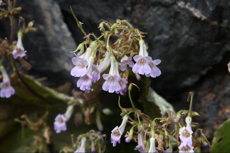 此次调查的苦苣苔分别为江永报春苣苔、宽脉报春苣苔、粉花报春苣苔、新宁报春苣苔、紫纹马铃苣苔、粗筒报春苣苔、石山苣苔、东南长蒴苣苔、桂林小花苣苔,6种为湖南特有,并在区域内调查到阳明山杜鹃、尖叶栎、野生稻、金钱松、新宁羽叶报春、尾囊草、石山棕、裸蒴,并发现一株野生杜仲(杜仲在中国红色名录中定级为野外灭绝)。