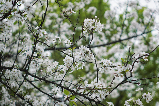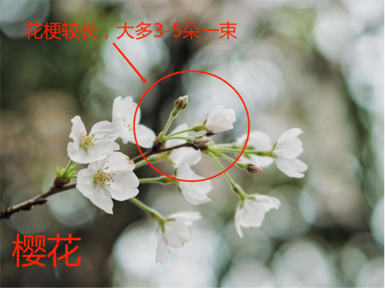 花序也就是花的排列方式,桃、梅和杏大多是一朵单生,即一个花芽只有一朵花,而樱花大多3-5朵成一束,呈伞房或伞形花序,所以樱花看上去是一簇一簇的。