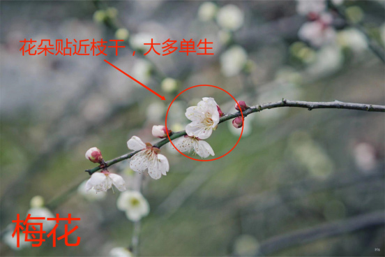 桃和梅的花几乎没有花梗,像是贴在枝干上一样;樱和李的花梗较长,花朵远离枝干。