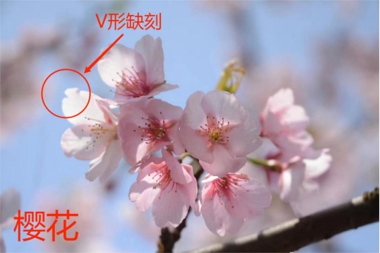 樱花的花瓣尖端一般都有V形缺刻,俗称“樱花缺”。桃、李、梅花瓣没有缺刻。