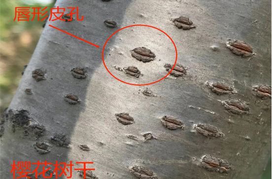 樱花树干上有像嘴唇一样的皮孔,常连成横纹,也称为“皮孔线”,这也是很明显的特征。