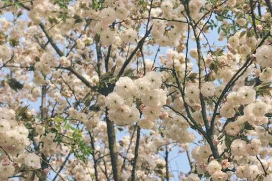 ‘普贤象’樱主要分布在樱花湖东侧和樱花园。花期一般在三月底到四月初,花重瓣,白中带微粉色,开花时有叶片相伴。‘普贤象’樱花中的雌蕊变异成了细长的叶子,从花心里伸出来,就像两根象牙,人们把它想象成普贤菩萨所骑的大象,因此得名‘普贤象’樱。