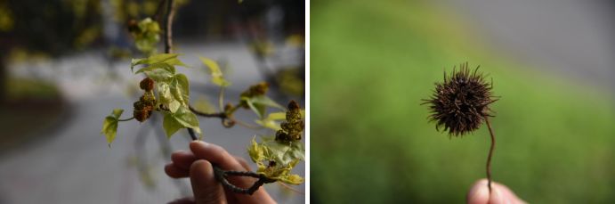 枫香树花序和嫩叶                        枫香树果序