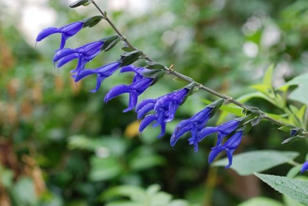 深蓝鼠尾草(Salvia guaranitica),唇形科鼠尾草属植物,是一种多年生草本植物,可长到一米多高,茎被柔毛,叶对生,叶缘有齿,叶片有褶皱,花期5~10月,二唇形花朵深蓝色(图1、图2)。