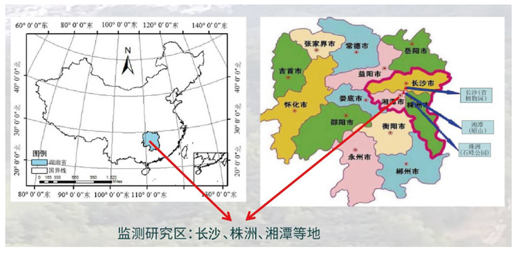 湖南长株潭城市群森林生态系统国家定位观测研究站(以下简称“长株潭生态站”)位于长江中下游长株潭城市群,是我国建立的第一个城市森林生态站。长株潭生态站观测网络呈一主两辅多点布局,主站设长沙市雨花区湖南省植物园内(28°3'36"N,113°1'35"E),辅站分别位于株洲石峰(27°51'43"N,113°6'27"E)和湘潭昭山(27°58'22"N,113°0'15"E),多点分布长株潭三市各地,并逐渐辐射全省。长株潭生态站于2013年获原国家林业局批准建站,2019年获湖南省科技厅批复为野外科学观测研究站,2019年5月通过验收。该站归口管理单位为湖南省林业局,技术支撑单位为湖南省植物园与中南林业科技大学,严格按照国家及行业规范标准挂牌运行。