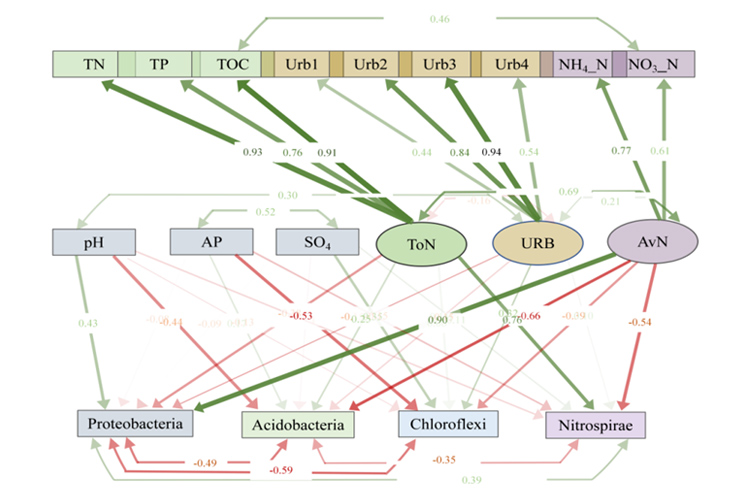 图3结构方程模型研究了城市化强度、环境因子、细菌丰度沿城市化强度的相互作用,箭头表示显著效应大小(P<0.1),箭头的厚度表示关系的强度(绿线表示正关系,红线表示负关系),P值为标准化路径系数。ToN,总营养成分;AvN,有效态氮;URB,基于不透水面面积的城市化强度。