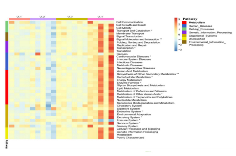 图4基于16S rRNA扩增子测序结果预测不同城市化强度下微生物群落细胞处理、遗传信息处理和代谢等相关功能。*表示不同城市化强度之间存在显著性差异(Kruskal-Wallis检验,**P<0.01,*P<0.05)