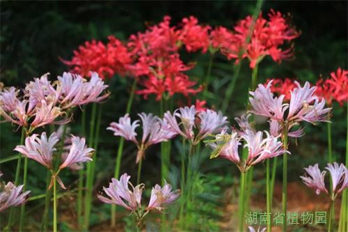 粉色系的石蒜有着优雅的气质,其代表换锦花的花瓣略宽,花瓣的粉色与尖端的蓝色偏浅,花朵为辐射对称(喇叭型)。而粉色的香石蒜,初开时为白色,渐变肉粉色;花被裂片腹面散生红色条纹。推荐观赏点:神龙本草园