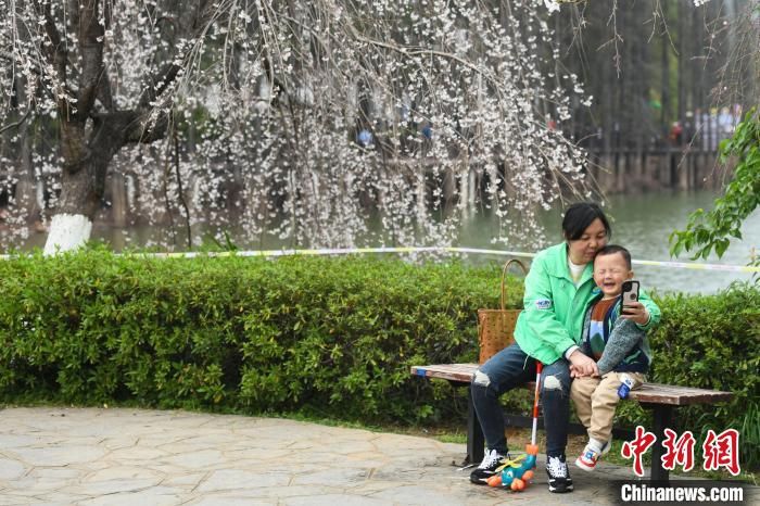 家长与孩子在樱花树下自拍。杨华峰摄