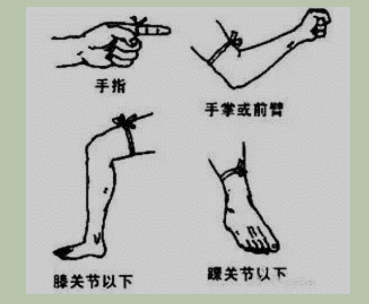 可用绳子或者用衣服撕成的布条进行结扎,结扎时,远心端可以摸到动脉的搏动,这种松紧度,和平时在医院抽血化验时,那种橡胶管绑的松紧度差不多。每半小时到1小时松开结扎部位3分钟。