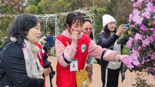 市民在小志愿者们的悉心讲解下踏入花海,感悟自然与生命的意义。无论是刮风还是下雨,小志愿者们坚守岗位,履行职责,那来回穿梭的“红马甲”格外引人注意,形成一道道靓丽的风景线!