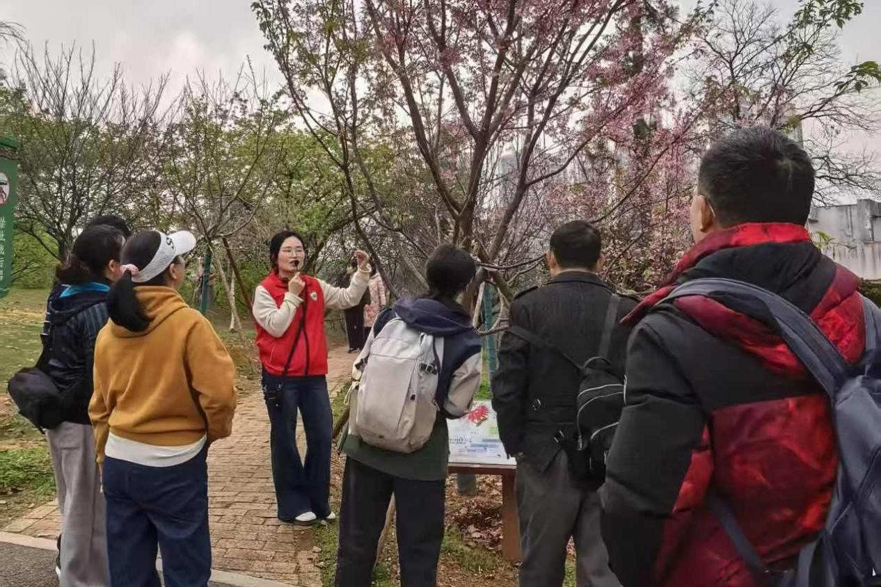本次活动依托园区早樱次第绽放的良好景致,全天安排3场定时讲解服务,向广大游客免费开放。为确保讲解服务质量,活动前期,园区特别邀请樱花专家,对青年志愿者开展樱花知识、讲解技巧等专项培训,打造兼具服务能力与科普水平的“樱花科普达人”队伍。讲解过程中,志愿者们围绕牡丹樱、飞寒樱等主要樱花品种的辨识要点、生长特性进行详细讲解,同步讲述樱花种质资源收集、保存的幕后工作故事,将赏樱体验与生物多样性保护科普有机结合,让游客在沉浸式赏樱的同时,系统了解樱花知识,自觉接受生态保护理念,实现“赏樱传文明、科普润人心”的活动目标。