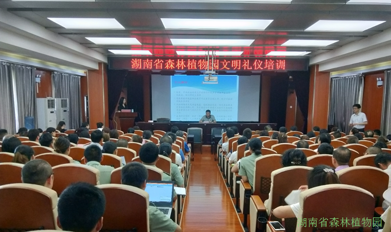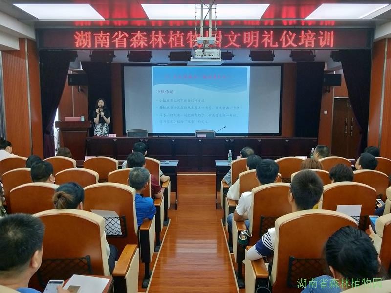 为提升旅游服务水平,提高文明礼仪整体素质,巩固4A景区和省直文明标兵单位成果, 5月18日,省植物园举办文明礼仪培训活动,特邀中南林业科技大学旅游学院饭店管理研教室主任杨芳老师作精彩授课。园副主任蒋利洪主持活动,在家园领导郑焱、王文生、胡俊东出席,全园中层干部,行政管理部门、旅游中心、科普中心、门票中心、安保处一线岗位的同志和园内各经营单位从业人员参加培训。