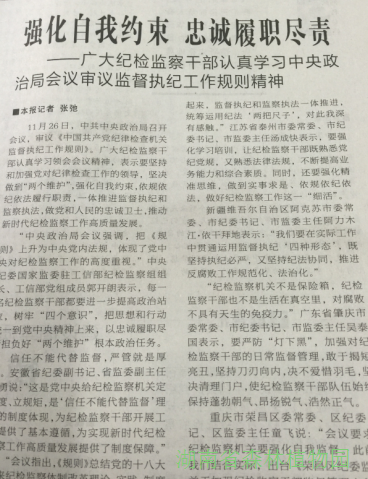 全体干部认真学习领会会议精神,表示要坚持和加强党对纪律检查工作的领导,坚决做到“两个维护”,强化自我约束,依规依纪依法履行职责,做党和人民的忠诚卫士,推动新时代纪检监察工作高质量发展。