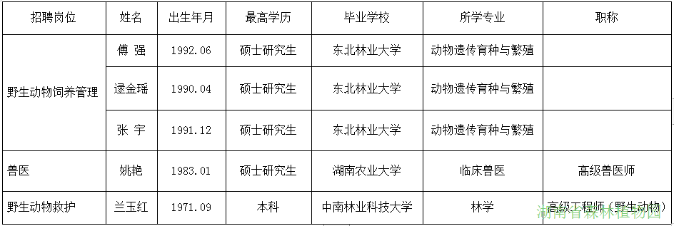 湖南省野生动物救护繁殖中心2019年公开招聘工作,经发布公告、报名、资格审查,现将通过资格审查的人员名单公布如下: