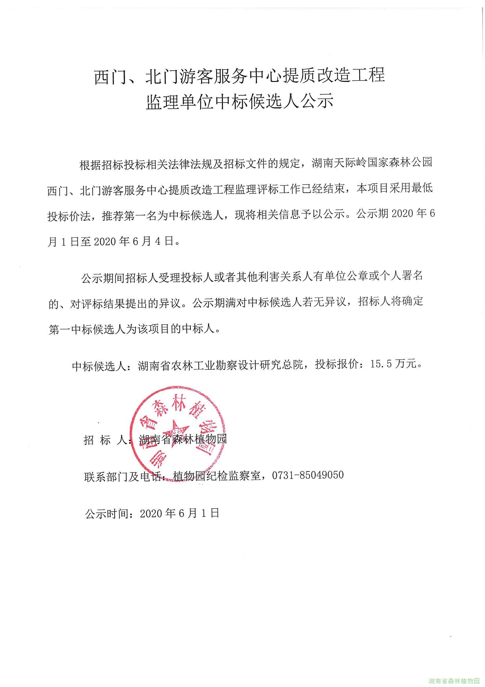 根据招标投标相关法律法规及招标文件的规定,湖南天际岭国家森林公园西门、北门游客服务中心提质改造工程监理评标工作已经结束,本项目采用最低投标价法,推荐第一名为中标候选人,现将相关信息予以公示。公示期2020年6月1日至2020年6月4日。