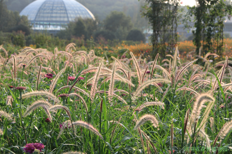 除了大面积的向日葵还有以粉黛乱子草、糖蜜草、金红羽狼尾草、紫叶狼尾草为主打的数十种观赏草。有的花序突出于叶丛之上、有的犹如喷泉般四散、有的悬垂于纤细的茎杆顶端如同浪花在园中翻滚,灵动壮观,尽情展现动态美感。