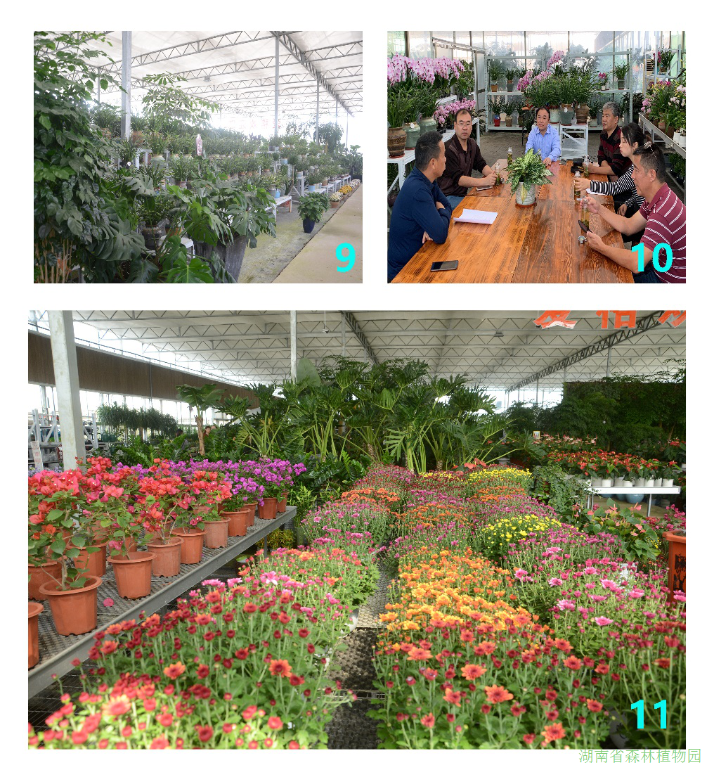 湖南斯利农业有限公司(9.室内盆花生产;10.专家与企业负责人座谈;11.引种的菊花新品种。)