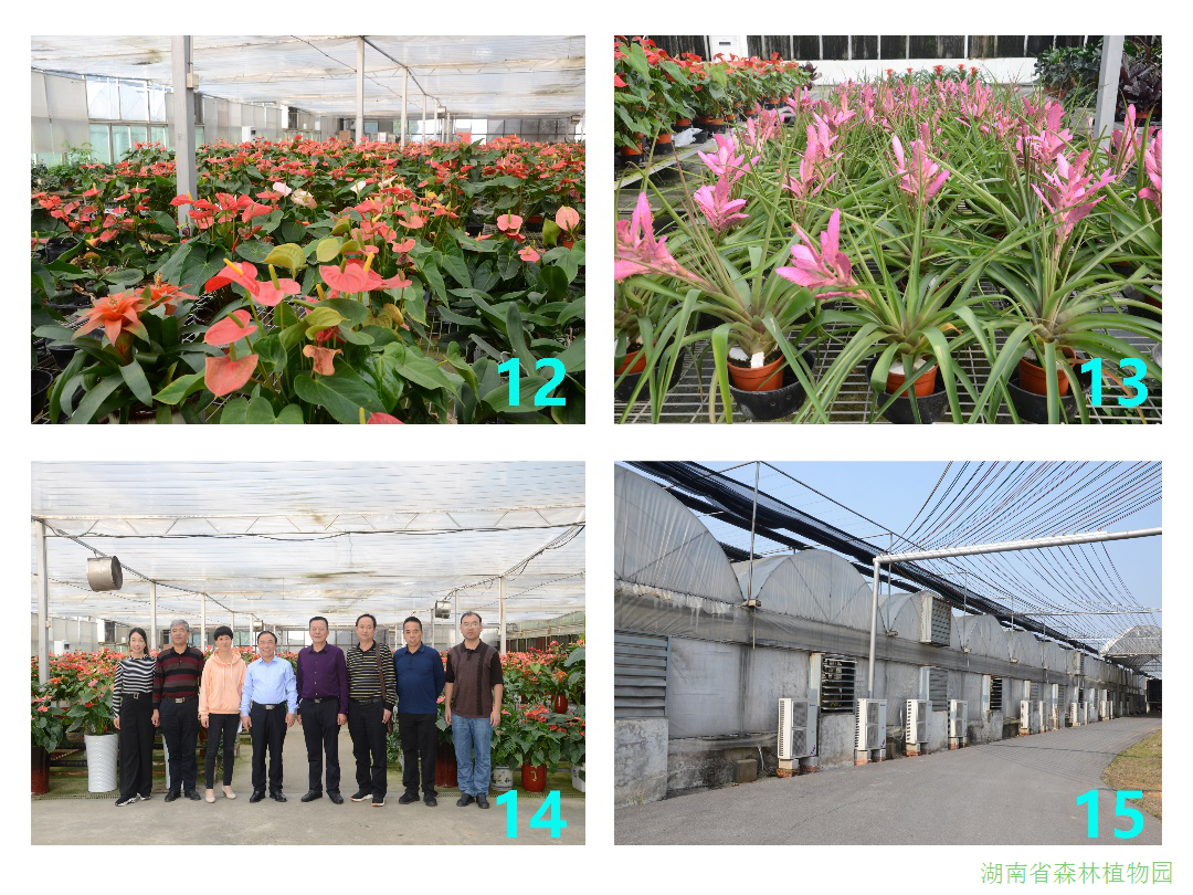 湖南云田园林市政建设集团有限公司(12、13.公司主营品种红掌、凤梨;14.专家组与企业负责人合影;15.大棚设施。)