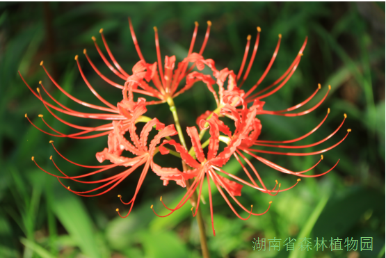 石蒜秋季出叶,春天枯萎,夏末抽出长长的花梃,盛开时,远看就好像有红线或黄线组成的镂空花球,十分醒目。目前我园已引种收集了石蒜、中国石蒜、稻草石蒜、忽地笑、换锦花、玫瑰石蒜等9个品种,为有效保护和利用石蒜属植物种质资源打下了坚实基础。