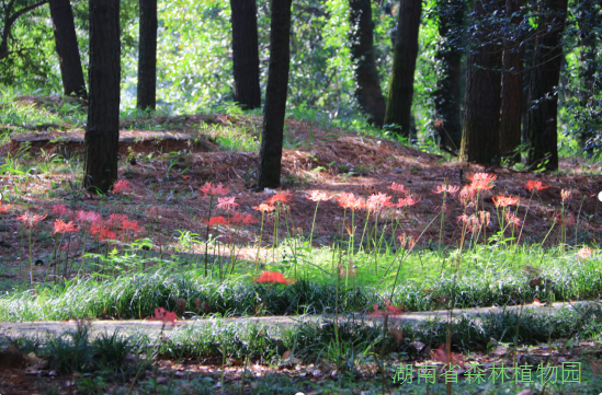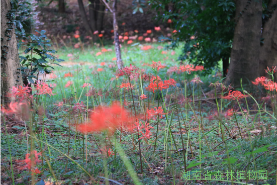 在植物园蝴蝶谷至樱花大道沿途林缘,一群妖娆的石蒜们正肆意绽放,花瓣反卷犹如龙爪一般,星星点点的点缀着碧绿的草地。现在正值最佳观赏期。