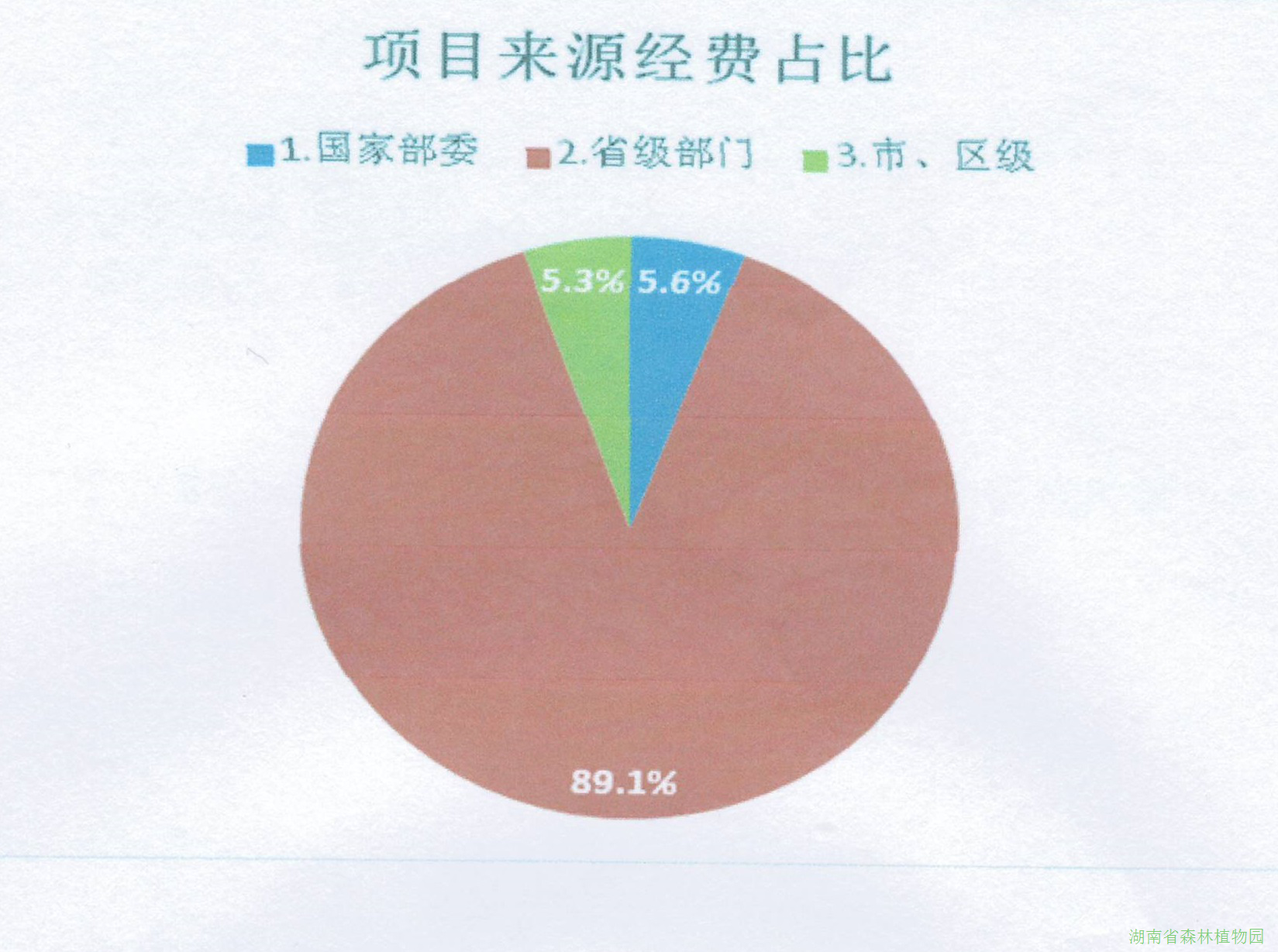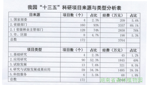 科研项目是科技工作开展的基础,“十三五”期间,我园共申报各类科研项目393项,其中立项172项,落实项目经费3764万元。所有立项项目按来源分,国家部委项目4项(占比2.3%),经费209万元(占比5.6%);省级项目(含中央财政林业科技推广项目)160项(占比93%),经费3357万(占比89.1%);省级项目中来自林业主管部门的项目128项(占比74.4%),经费2858万(占比75.9%);市、区级项目8项(占比4.7%),经费198万元(占比5.3%);可见来自省级主管部门的项目和经费均占比最大,其中又以省级林业主管部门为主,项目个数和经费均占70%以上,而来自国家部委和市区主管部门的项目和经费均不到6%。按项目类型分,基础研究类4项(占比2.3%),经费45万(占比1.2%);应用研究类90项(占比52.3%),经费1845万(占比49%);试验发展类13项(占比7.6%),321万(占比8.5%);研究与试验发展成果应用类59项(占比34.3%),经费1485万(占比39.5%);科技服务类6项(占比3.5%),经费68万(占比1.8%);可见应用研究类项目占比最大,超过50%,研究与试验发展成果应用类项目占比次之,而基础研究、试验发展和科技服务类项目境均占比很少,尤其是基础研究类项目所占最少,还不到3%。通过项目数据比较分析,我园“十三五”期间项目来源集中于省级林业主管部门,项目类型主要偏向于应用研究类和研究与试验发展成果应用类,项目结构极不平衡,今后要扩大和丰富项目来源,尤其要扩大国家部委和省科技主管部门的项目申报和立项,同时要着重加强基础研究和科技服务,增强科技创新能力和扩大社会影响力。
