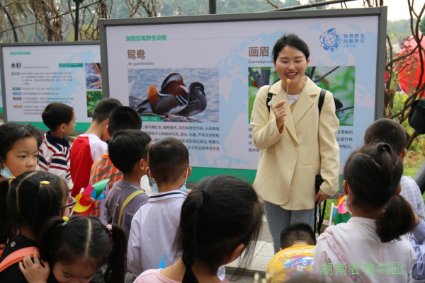我园自然教育中心副主任黄秀老师给同学们做了精彩的解说,首先黄秀老师介绍了“世界野生动植物日”是联合国大会为了提高人们对世界野生动植物的认识而设立的节日,今年的3月3日是第9个世界野生动植物日,我们中国的活动主题就是现在大家看到的展板上写的“关注旗舰物种保护,推进美丽中国建设”。 随后,黄秀老师给大家介绍了长江江豚、鸳鸯、画眉、水杉、珙桐、隆平水韭、湘妃水韭等珍稀的动植物。同学们都很认真地听黄秀老师的讲解,黄秀老师的讲解内容深入浅出,风趣幽默,互动式的问答,激发了同学们极大的兴趣,现场气氛非常热烈。