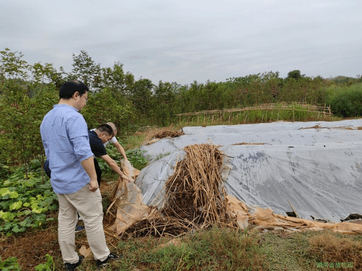 我园景观研究所承担的2022-2024省林业科技创新项目“生态脆弱地区青钱柳等多功能树种定向培育关键技术研究与示范”在湘潭基地实施,由于今年遭遇历史特大高温干旱天气,基地苗木抗旱及病虫害防治压力很大,新成立的景观所对这个项目高度重视,罗军所长多次要求要举全所之力给予支持, 圆满完成项目目标任务。9月26日上午,罗军所长、项目主持人陈永安组织景观所相关专业技术人员赴湘潭市鹤岭镇青钱柳标准化栽植基地进行调研。详细了解苗木抗旱及病虫害治理情况,由于抗旱及时、措施得力,目前青钱柳苗木成活率在90%以上,总体长势良好,病虫害也得到有效遏制。根据项目实施要求,技术人员还对青钱柳示范林土壤、环保植物基质进行了样品采集,同时对景观所下一步工作及基地规划建设进行了交流探讨,为景观所后续项目推进奠定了坚实基础。