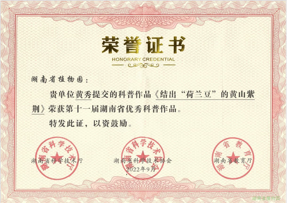 近日,我园黄秀、陈俊伟等人原创的科普微视频《结出“荷兰豆”的黄山紫荆》荣获第十一届湖南省优秀科普作品奖。