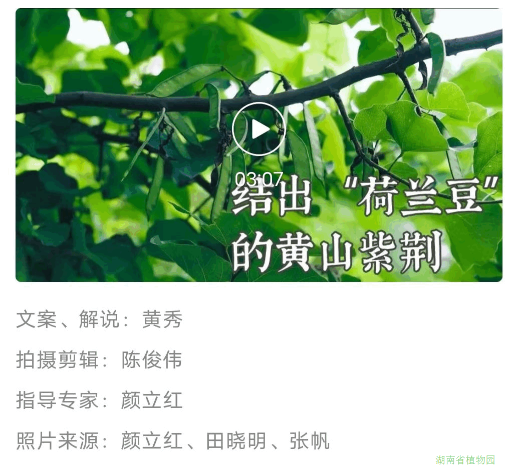 该科普微视频是全网首详细介绍黄山紫荆在湖南的发现、研究与应用。视频以果实形似“荷兰豆”为切入点,引出本土植物“黄山紫荆”,介绍了它的生长习性与形态特点,通过与它的亲戚“紫荆”进行叶、花、果比较,加深对它的认识。